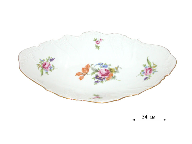 Блюдо для хлеба 34см "Мейсенский букет" от всемирно известного, крупнейшего Чешского производителя. Блюдо из фарфора будет прекрасным украшением вашего праздничного стола, а так же достойным подарком для ваших друзей, коллег, знакомых. Все изделия изготовлены на современном оборудовании, с использованием более чем двухвековых традиций старых мастеров. Высокое качество и уникальный дизайн изделий, сделали предприятие "Thun" признанным мировым лидером в производстве посуды из высококачественного фарфора. Вся посуда из Чешского фарфора сертифицирована по Европейским и Российским стандартам. Не рекомендуется мыть в посудомоечной машине! Посуду с покрытием из металла категорически запрещено ставить в печь СВЧ.