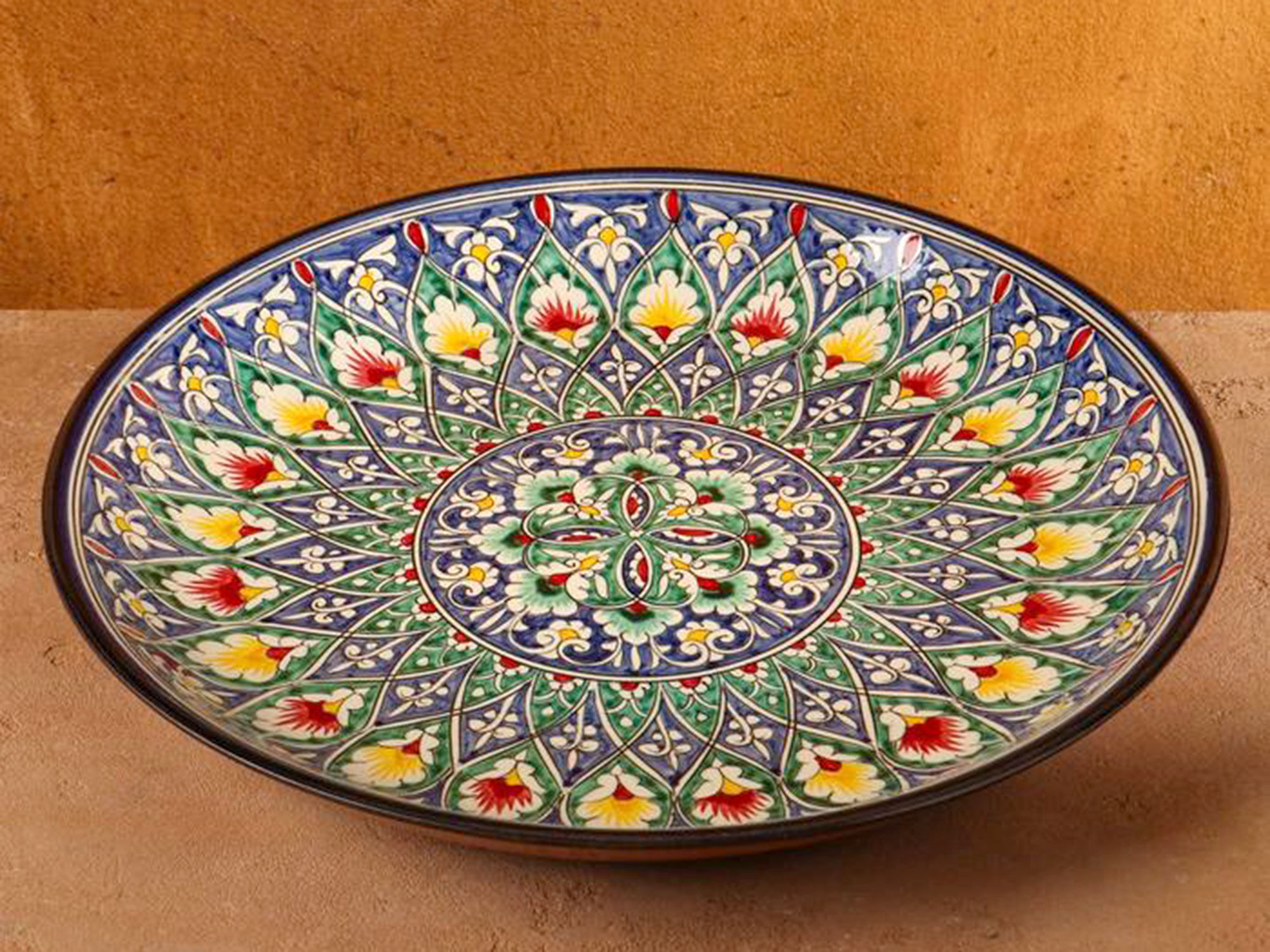 Ляган — неглубокое блюдо с округлыми стенками, в котором традиционно подают плов. На ляган можно выкладывать и фрукты, так он станет постоянным украшением интерьера. Посуда с национальной росписью станет отменным подарком для ценителей высокородной посуды. Риштан — город на востоке Узбекистана, один из древнейших в Ферганской долине. С давних времён Риштан славится своим гончарным искусством изготовления цветной керамики.
