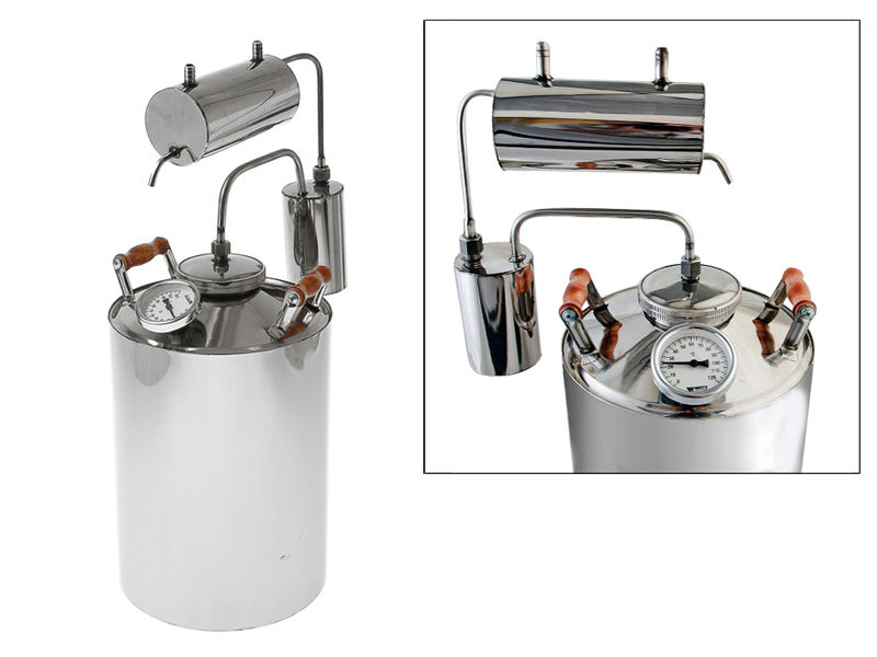 Самогонный аппарат Магарыч Премиум-Т БКДР с увеличенной горловиной перегонного куба, деревянными ручками и плоским дном, за счёт чего стало возможным использовать аппарат на стеклокерамических плитах. Все части комплекта изготовлены из пищевой нержавеющей стали, которая отличается высокой прочностью. Все соединения выполнены с использованием аргонной сварки – швы надежны и выдерживают высокие температуры. Аппарат отличается хорошей производительностью до 2 л/ч и при этом имеет привлекательную цену. Охладитель оснащен тремя штуцерами – для подвода и отвода воды, а также для выхода дистиллята. Наличие сухопарника позволяет предотвратить попадание браги в охладитель. Конструкция аппарата разборная, его легко хранить. Все соединения между частями комплекта резьбовые. Это обеспечивает надежную герметичность. Встроенный в куб термометр позволяет следить за температурой во время всего процесса перегонки.