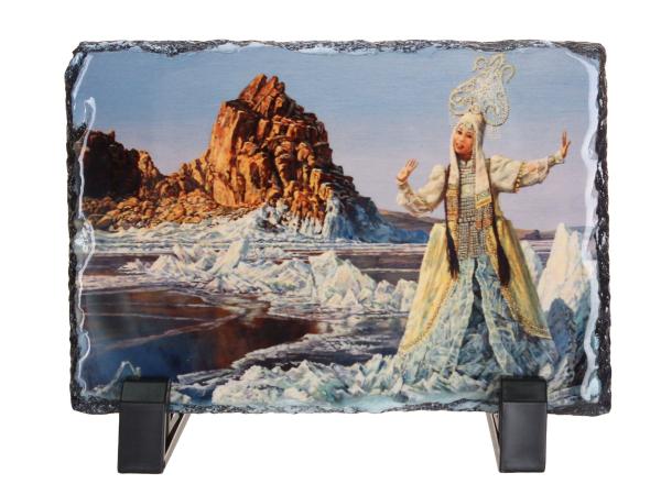 Мистический Байкал Георгия Инешина завораживает людей по всему миру. Работы художника хранятся в частных коллекциях в США, Китае, Франции, Германии. Художник очеловечивает природу: волны обретают женский облик, облака сливаются в поцелуе. Но и люди, в свою очередь, становятся самой природой: повелевают звёздами, парят вместе с птицами, превращаются в " Дерево грёз". В наших магазинах вы можете приобрести "частичку Байкала", с мистическим видением художника, в виде картин и магнитов. Печать на камне "Январь. Первый лёд" (природный сланец) картина Г. Инешина. Представлена в размерах: 15х20 см. Упакована в пупырчатый пакет, коробку. Подставки из чёрного пластика прилагаются.