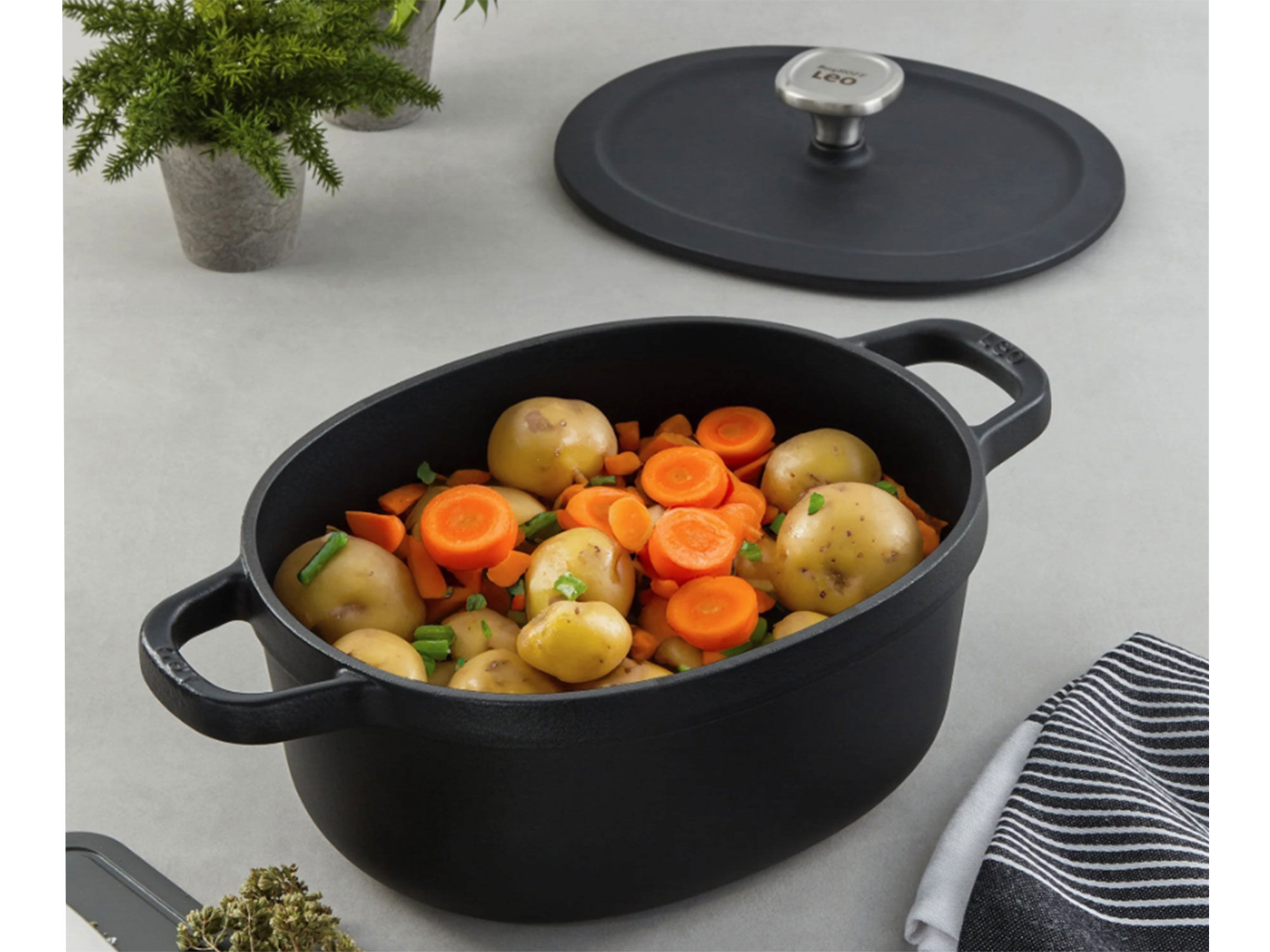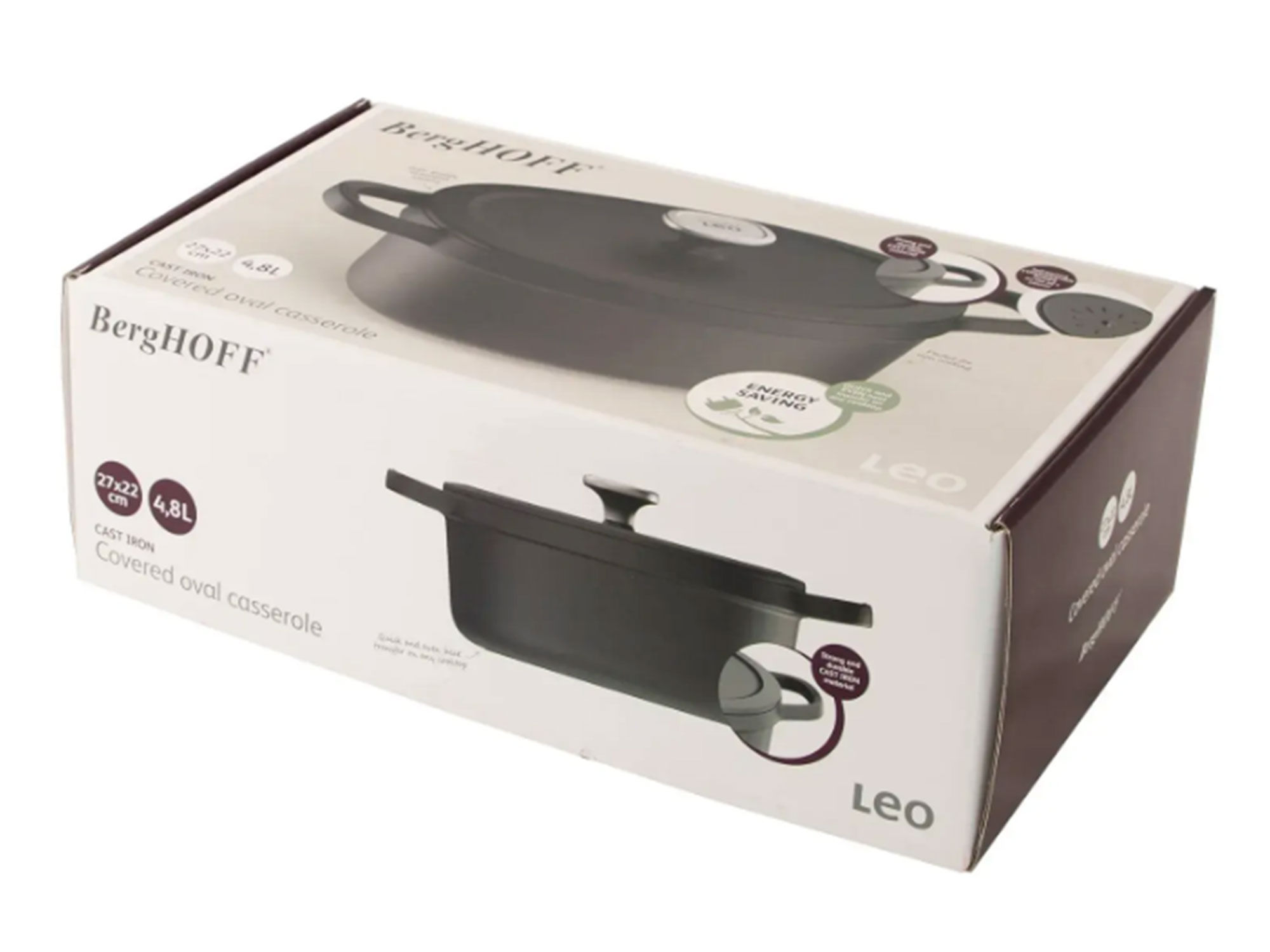 Овальная чугунная кастрюля от BergHOFF – объёмом 4,8 литра ( размер - 27х22 см) идеально подходит для запекания целой курицы или приготовления других блюд, где требуется большой объём. Кастрюля выполнена из чугуна, который обеспечивает равномерное распределение тепла и сохранение его в течение длительного времени, обеспечивая идеальные условия для медленного тушения или запекания. Благодаря универсальности материала, эта кастрюля подходит для использования на любых видах плит, включая индукционные, а также может быть использована для запекания в духовке. Бренд BergHOFF известен своим высоким качеством продукции, надёжностью и долговечностью. Чугунная кастрюля прослужит вам долгие годы, помогая готовить вкусные и здоровые блюда для всей семьи. Благодаря уникальным свойствам чугуна, универсальности применения и стильному дизайну, кастрюля станет вашим незаменимым помощником в приготовлении новых, вкусных и здоровых блюд.