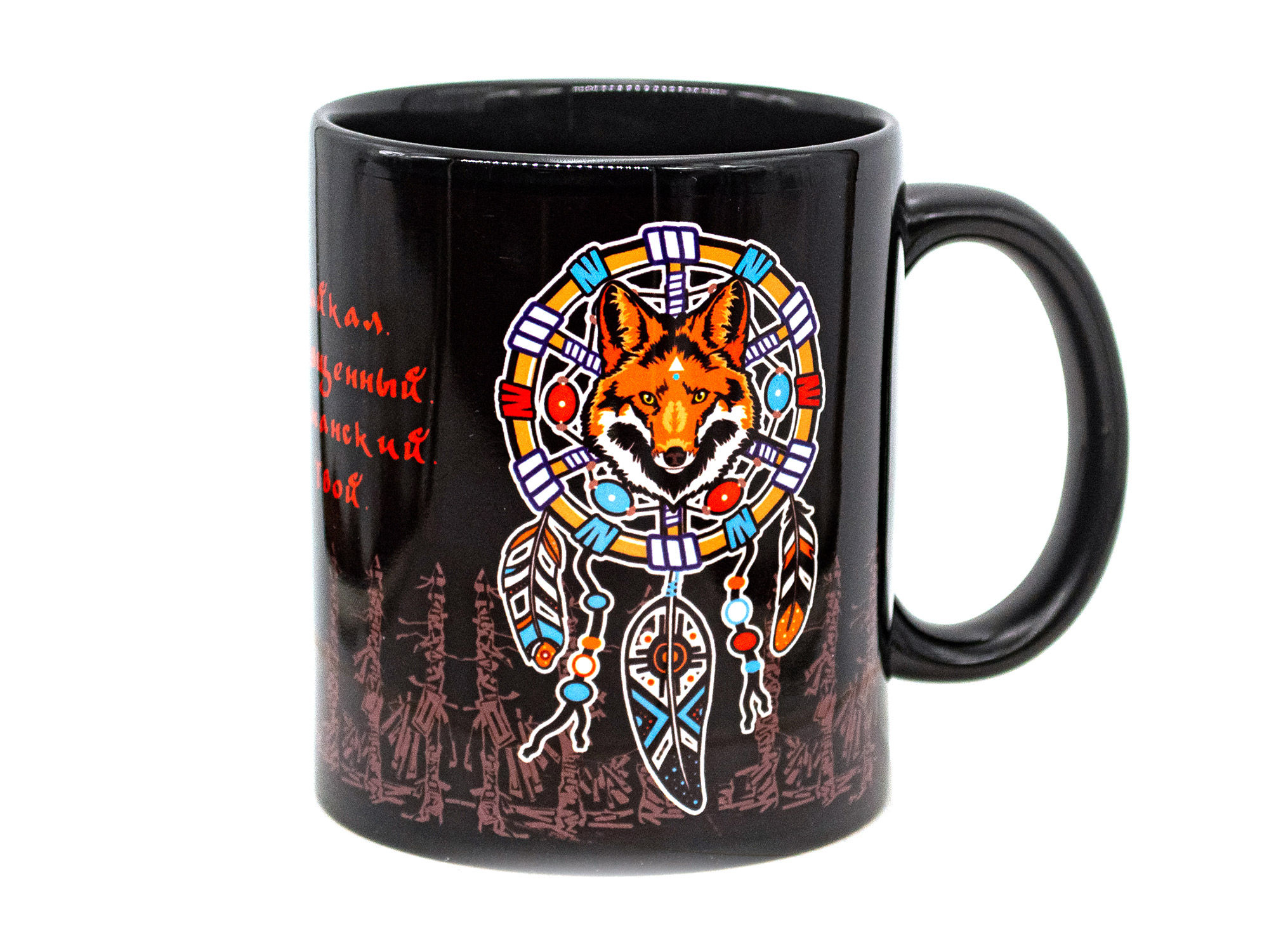Керамическая кружка с ручкой, цветная, с авторским принтом." Лиса в ловце" зарядит своей Силой любой напиток, помещённый в эту кружку! Хороший подарок с берегов Байкала для себя Любимого или для Друга. Метод нанесения: сублимационная термопечать. Изображение "запекается" на кружке при высокой температуре. Можно мыть в посудомоечной машине. Сделано на Байкале!