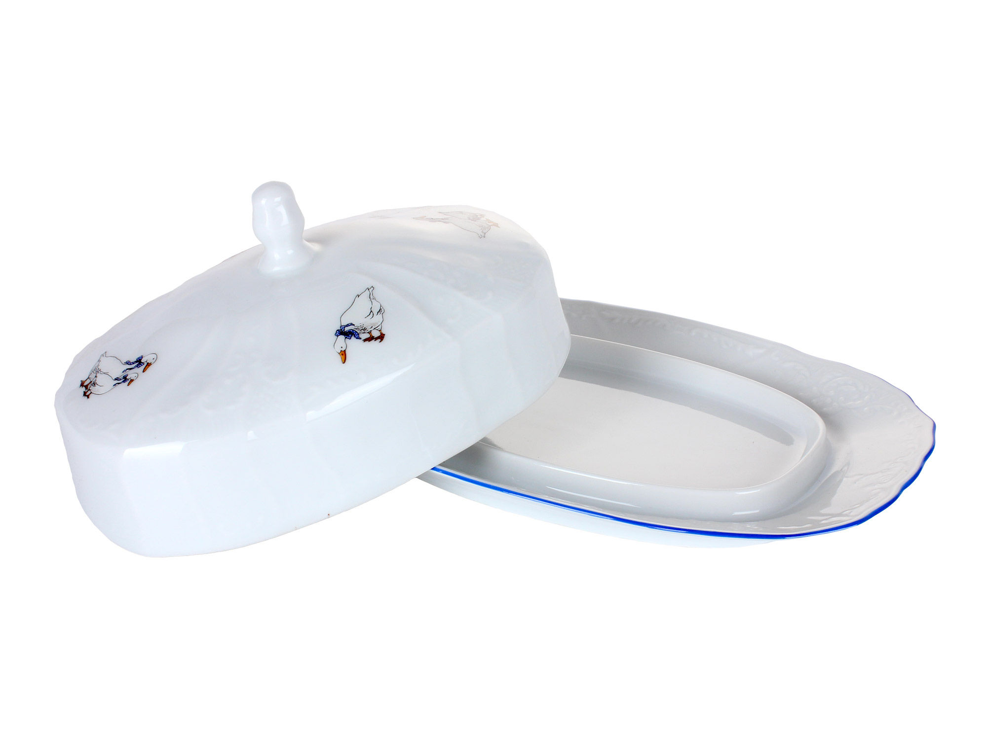 TM Lefard коллекция "Гуси" - посуда и предметы сервировки из качественного фарфора. Гуси с синими бантами в горошек на белоснежном фарфоре украсят любой интерьер. Изящество линий и форм придает изделиям изысканную респектабельность. Все это делает предметы коллекции прекрасным подарком. Продукция прошла сертификацию и безопасна для контакта с пищевыми продуктами. Нельзя ставить в микроволновую печь, не рекомендуется мыть в посудомоечной машине.