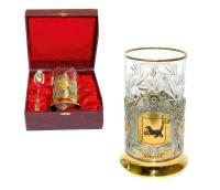 Подстаканник: высота - 10,5 см, диаметр - 8,5 см. Стакан: высота - 11 см, диаметр - 7 см, объем стакана - 250 мл. хрусталь, PbO 24%. Ложка: 14,5 см. нержавеющая сталь с золочением и лазерной гравировкой.