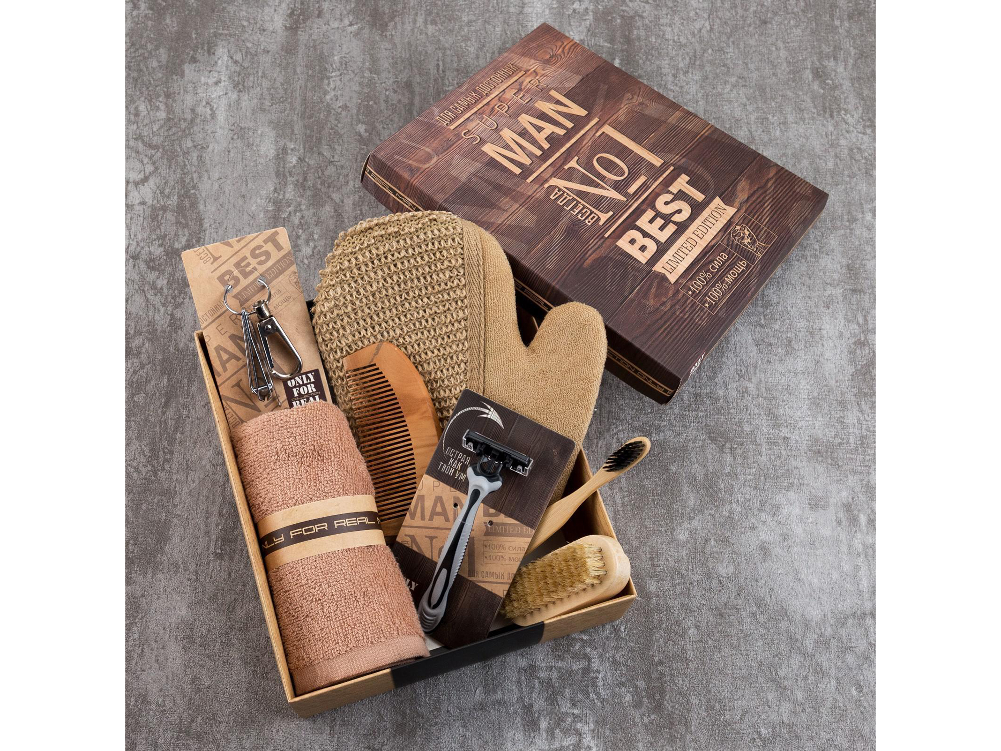 Подарочный набор «Man № 1» — стиль и практичность в каждом элементе! Ищете идеальный подарок для сильного и уверенного в себе мужчины? Набор «Man № 1» объединил всё необходимое для ежедневного ухода в элегантной упаковке. Это не просто комплект гигиенических принадлежностей — это знак внимания, который подчеркнёт ваше уважение и заботу. В стильной бежевой подарочной коробке вы найдёте продуманный набор аксессуаров: - полотенце (хлопок) — мягкое и впитывающее, идеально для рук и лица; - бритвенный станок — для гладкого и комфортного бритья; - варежка мочалка — для качественного очищения кожи в душе; - зубная щётка — для ежедневной гигиены полости рта; - принадлежности для маникюра — для аккуратного ухода за ногтями; - расчёска для волос — удобная и функциональная; - щётка — для поддержания опрятного внешнего вида. Подарочная коробка избавляет от необходимости дополнительно оформлять презент — можно дарить сразу после получения. Этот набор — идеальный вариант для: - мужа или партнёра — как знак заботы о его комфорте; - отца или сына — в знак внимания к их повседневным потребностям; - брата или друга — чтобы подчеркнуть дружескую поддержку; - коллеги или начальника — как вежливый и полезный корпоративный подарок. Основные характеристики: - название: подарочный набор «Man № 1»; - состав: полотенце, бритвенный станок, варежка мочалка, зубная щётка, принадлежности для маникюра, расчёска для волос, щётка; - материалы: дерево, пластик, хлопок; - цвет: бежевый; - упаковка: подарочная коробка. Сделайте выбор в пользу практичности и стиля — подарите набор «Man № 1»!