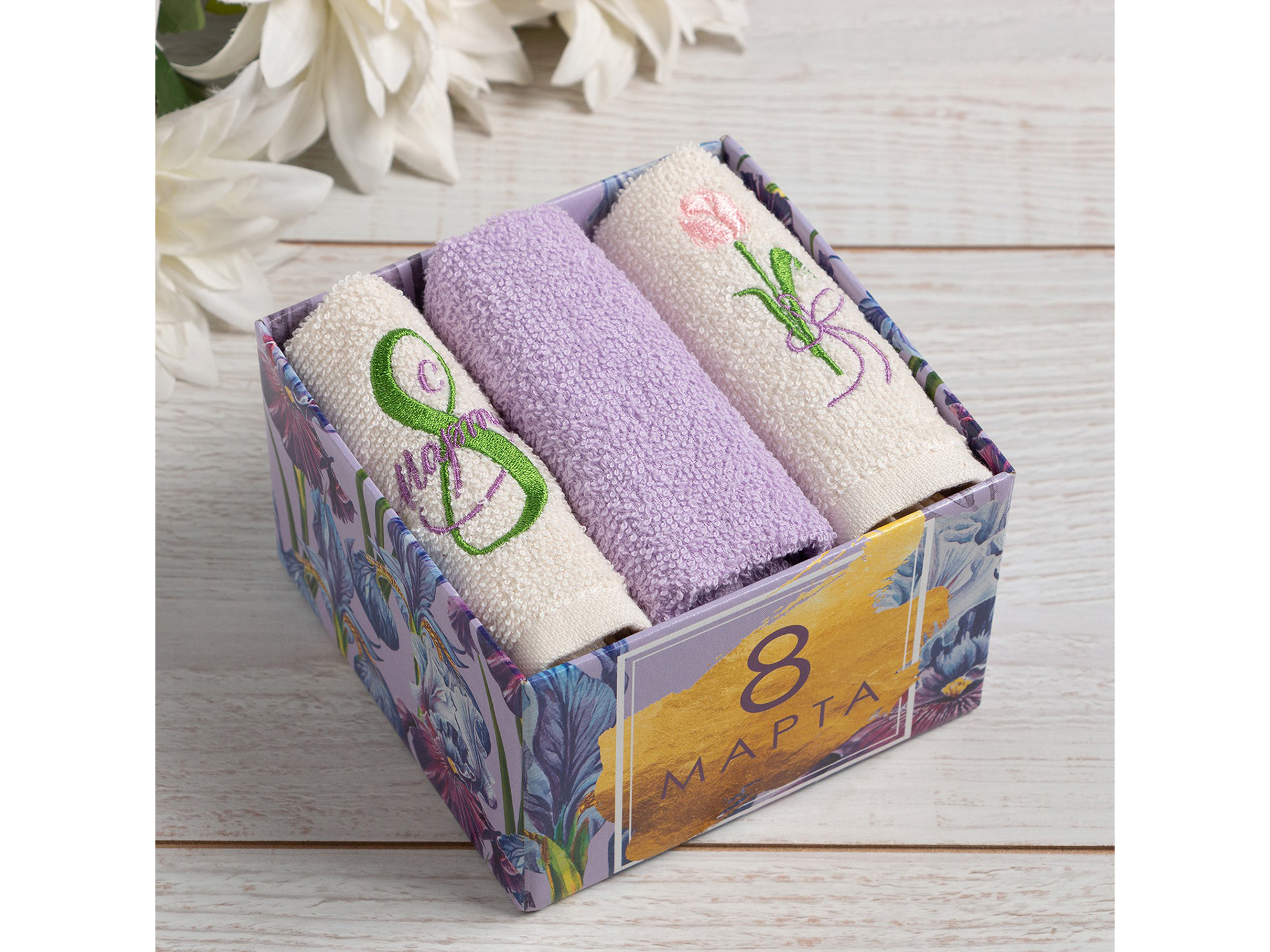 Набор полотенец «8 Марта» — нежный и практичный подарок к весеннему празднику! Подарите близким ощущение заботы и свежести с набором полотенец "8 Марта". Сочетание элегантного дизайна и праздничной упаковки делает этот комплект идеальным знаком внимания для любимых женщин. Полотенца изготовлены из 100 % хлопка плотностью 340 г/м — это обеспечивает превосходную впитываемость, мягкость, приятную для кожи, долговечность и сохранение внешнего вида после множества стирок. Подходит для ежедневного использования для рук и лица. Сочетание белоснежного и нежного сиреневого оттенков создаёт утончённый, весенний образ, который ассоциируется с пробуждением природы и женственностью. Надпись «8 Марта» на упаковке превращает набор в готовый подарок — не требуется дополнительная упаковка или оформление. Изделия изготовлены в России. Этот набор идеально подойдёт для поздравления: - мамы или бабушки — как знак любви и благодарности; - жены или подруги — чтобы подчеркнуть заботу и внимание; - коллеги или начальницы — в качестве вежливого и практичного подарка; - сестры или тёти — как тёплый знак родственных чувств. Основные характеристики: - название: набор полотенец «8 Марта»; - количество в наборе: 3 шт.; - размер: 30 * 30 см; - материал: 100 % хлопок; - плотность: 340 г/м; - цветовая гамма: белый и сиреневый; - особенность: праздничная упаковка с надписью «8 Марта»; - производство: Россия. Набор полотенец "8 Марта" - отличный подарок на на весенний праздник!