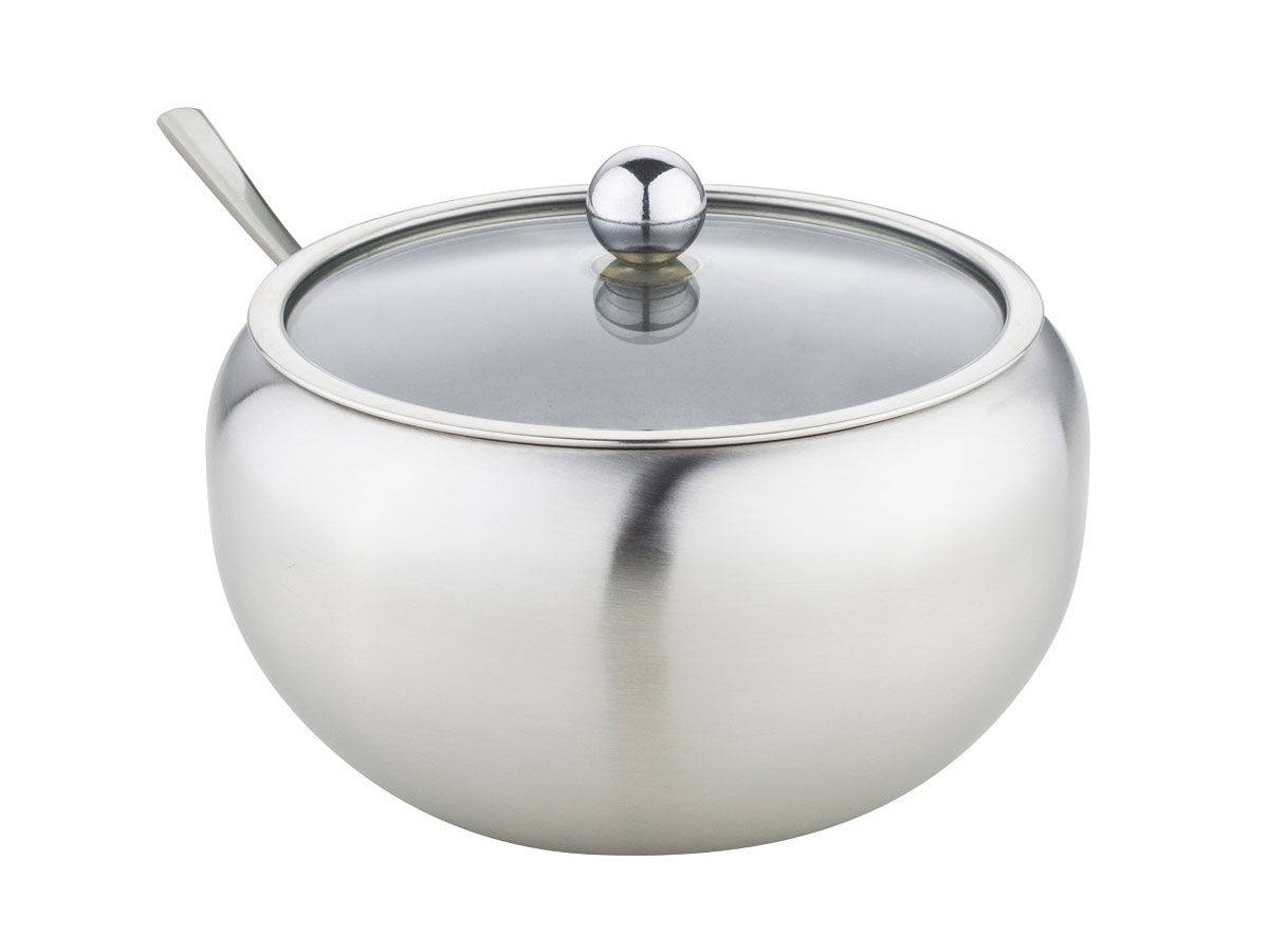Сахарница De Luxe в комплекте со стеклянной крышкой и ложкой будет красиво смотреться на столе и сохранит свежесть сахара. Объем 560 мл. Толщина стенки 0,6 мм. Ложка 14,6 см. Матовая поверхность. Материал нержавеющая сталь, стекло.