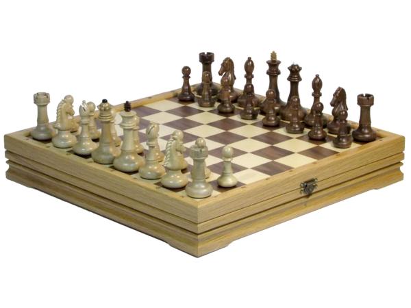 Шахматы 37х37 см RTC-5559 Это один из самых выразительных наборов шахматных фигур. Его яркой отличительной особенностью является прорези на фигурах офицеров и округлое основание фигур. Фигуры выточены вручную: светлые из скального граба, а темные из драгоценного американского ореха. Высота короля - 3,25 дюйма (около 8,2 см). В основании каждой фигуры установлен утяжелитель, благодаря чему фигура увесиста и приятно лежит в руке игрока. Основания фигур подклеены натуральной кожей для минимизации ущерба игровому полю при перемещении фигур. Доска выполнена из массива дуба 37х37 см. Поле набрано из попеременно расположенных квадратиков шпона клена (белые клетки) и американского ореха (темные клетки). Набор каждого поля осуществляется вручную. По краю поля нанесены буквенная и цифровая индексация ячеек. Внутри доски есть мягкий ложемент с отделниями для каждой фигуры, в результате чего фигуры не деформируются. Подарочный набор шахмат - подарок мужчине к любому празднику или юбилею. Игра в шахматы – игра королей, развивает интеллект, сочетает в себе элементы искусства, развивает логику.