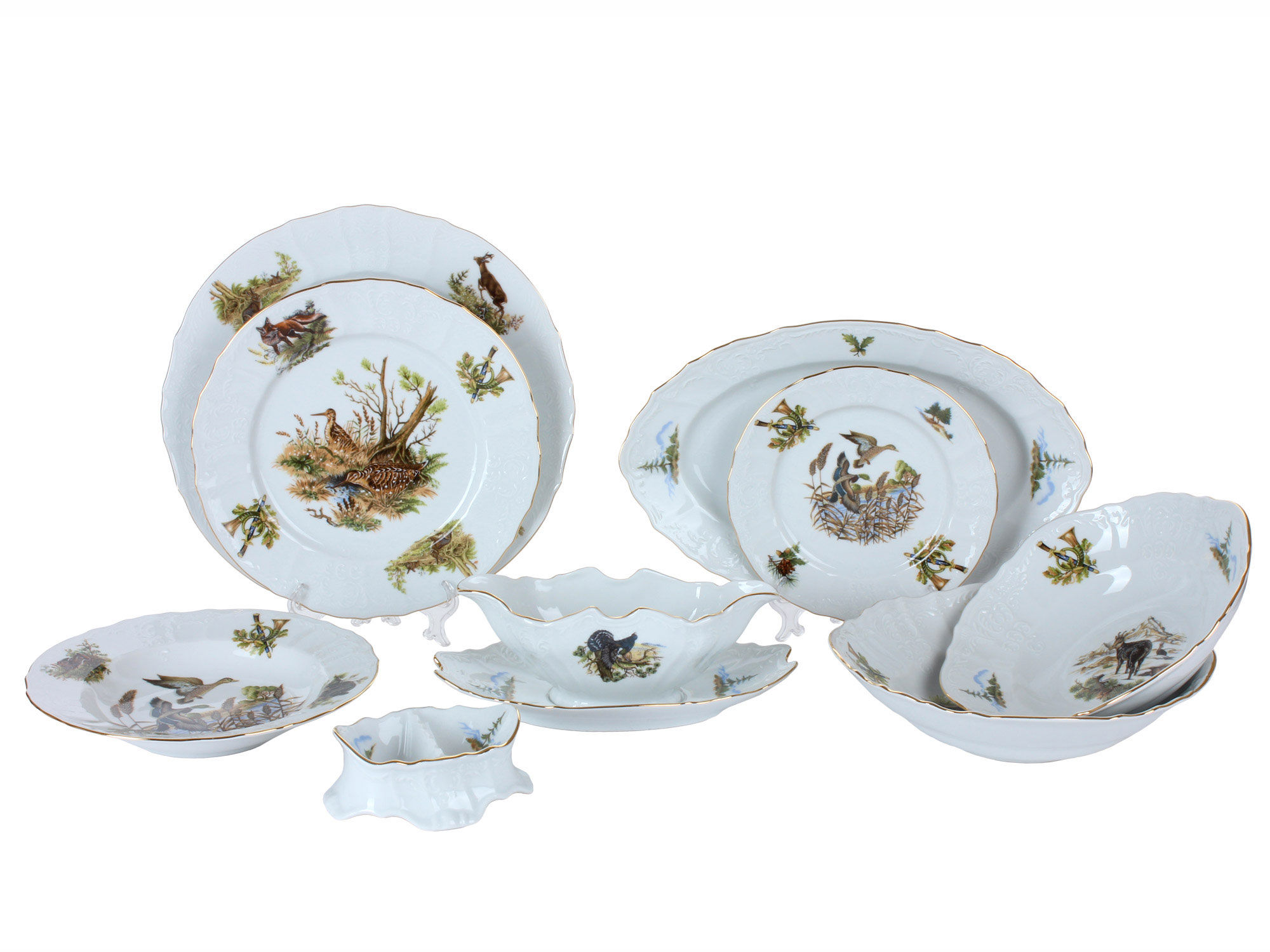 Тарелка подставная 25 см - 6 шт. Тарелка суповая 23 см - 6 шт. Тарелка десертная 19 см - 6 шт. Салатник 25 см - 1 шт. Салатник 23 см - 1 шт. Блюдо круглое 30 см - 1 шт. Блюдо овальное 34 см - 1 шт. Супница 2,5 л - 1 шт. Соусник с подставкой 500 мл - 1 шт. Прибор для специй двойной - 1 шт.
